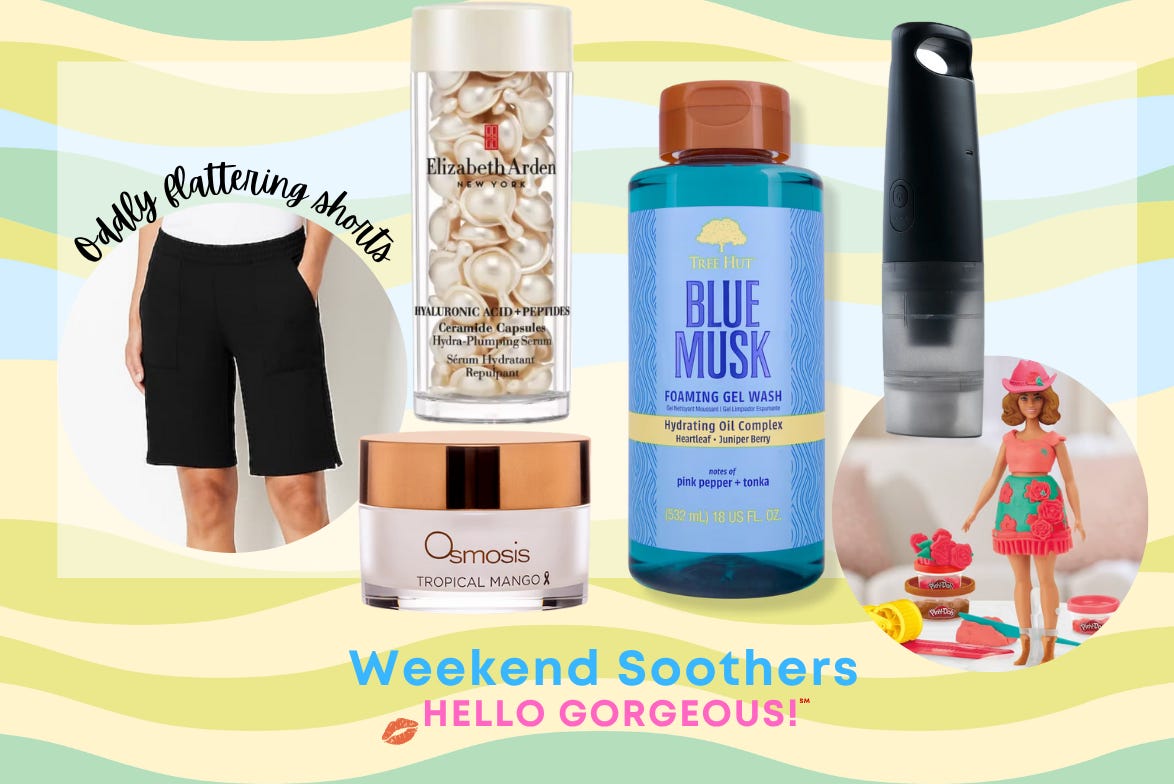 Kinder, gentler weekend treats including a new drop from Elizabeth Arden, a mango mask, a deep blue soak, shorts that flatter every tush, Play-Doh Barbie, and a one-hand mini vac